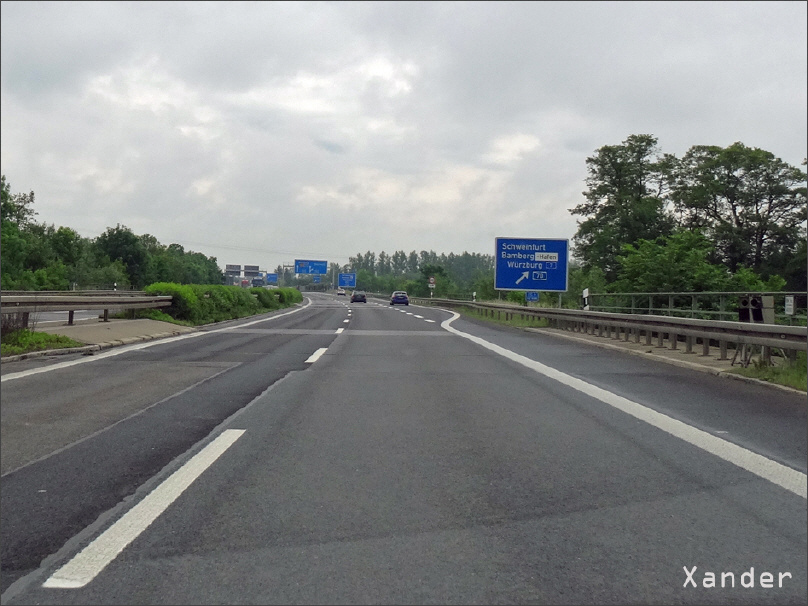 Wir befinden uns kurz vor der Abzweigung nach Schweinfurt. Das Autobahnkreuz ist nicht mit getrennten Verflechtungsstreifen ausgerüstet, so dass die Spurwechsel über den rechten Fahrstreifen abgewickelt werden; es ergibt sich eine entsprechend gesteigerte Unfallgefahr. (16/25) | ![]() |